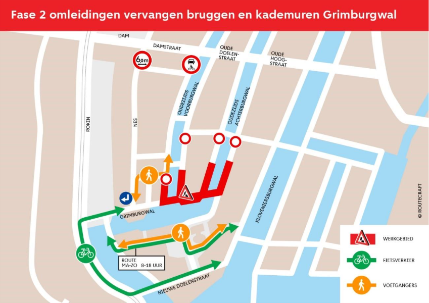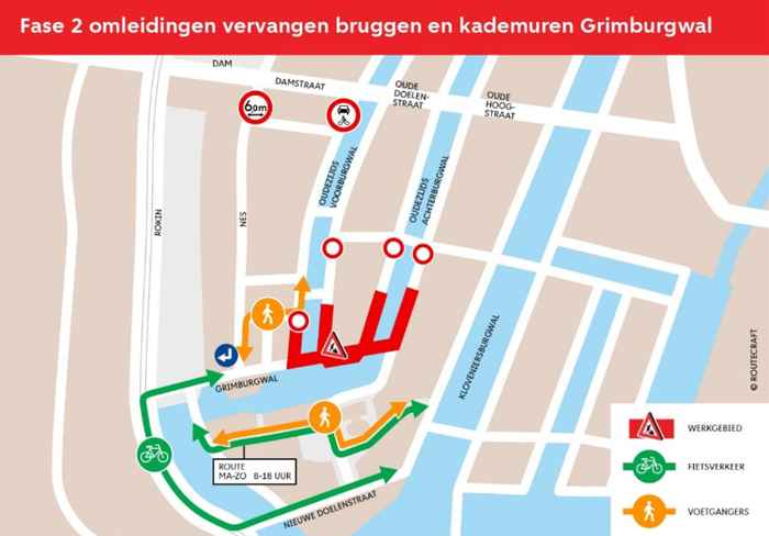 De aannemer werkt eerst aan de oneven kant van de Oudezijds Achterburgwal en schuift daarna stap voor stap door naar de even kant van de Oudezijds Voorburgwal. Deze werkzaamheden duren tot en met april 2026.