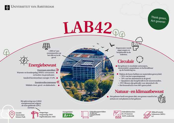 Ontdek hoe LAB42 circulair, energiebewust en natuurvriendelijk is ontworpen: van zonnepanelen in gevel én dak tot hergebruik van materialen en slimme energieopslag. In deze infographic zie je in één overzicht hoe het gebouw bijdraagt aan toekomstbestendige campusontwikkeling.