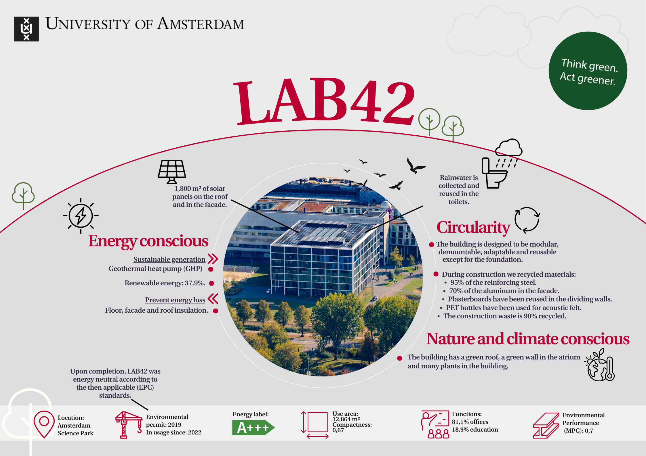 Discover how LAB42 was designed to be circular, energy-conscious, and environmentally friendly: from solar panels on the facade and roof to the reuse of materials and smart energy storage. This infographic shows how the building contributes to future-proof campus development.